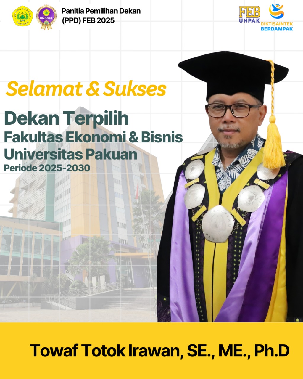 Fakultas Ekonomi dan Bisnis Universitas Pakuan mengumumkan dan mengucapkan selamat atas terpilihnya Towaf Totok Irawan, SE., ME., Ph.D